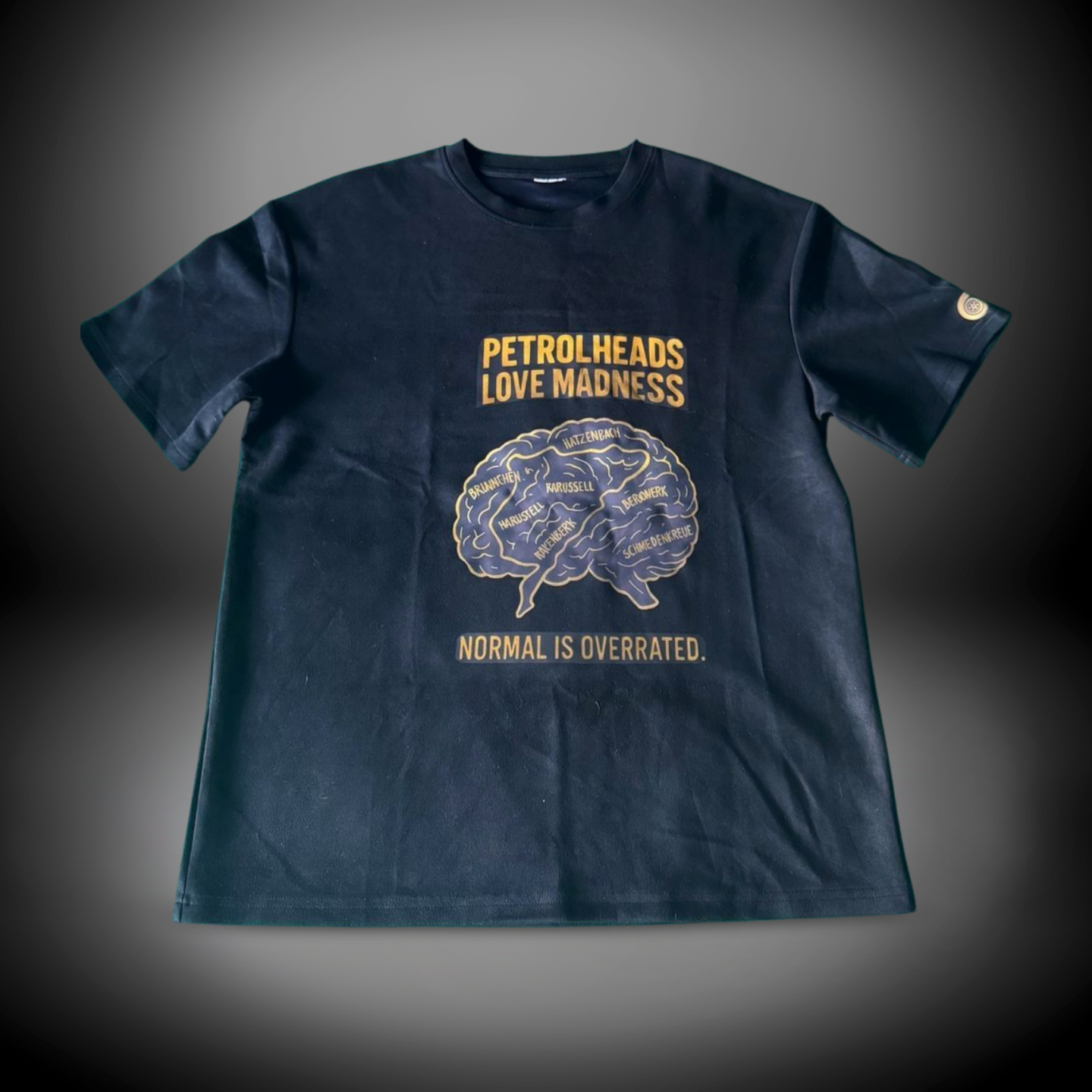 This one’s for the obsessed — the drivers who dream in boost, brake points, and apexes. The Petrolheads Love Madness Tee features a bold neural design showing Nürburgring’s most iconic corners mapped inside a petrolhead’s brain, with the unapologetic message: “Normal is Overrated.”
